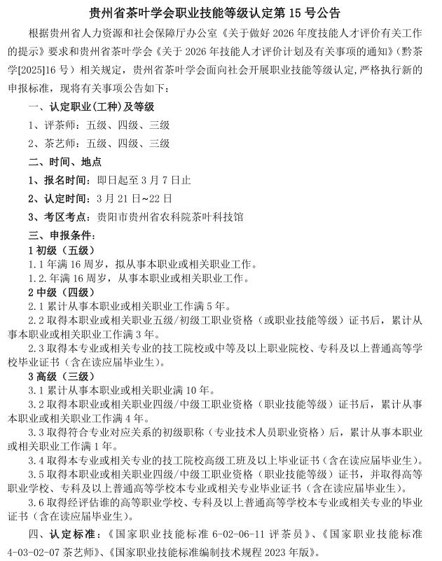 贵州省茶叶学会定于2026年3月21日在贵阳举办评茶师、茶艺师(五、四、三级)职业技能等级认定评价工作,报名截止时间3月7日。现将评价计划及有关事项通知如下,敬请关注。