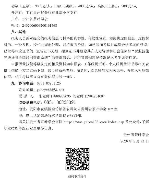 贵州省茶叶学会定于2026年3月21日在贵阳举办评茶师、茶艺师(五、四、三级)职业技能等级认定评价工作,报名截止时间3月7日。现将评价计划及有关事项通知如下,敬请关注。